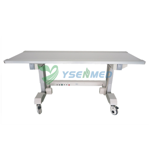 Electric, six-way floating radiographic table. It can be raised and lowered remotely by hand or foot switches. It features a foot lock for controlled floating. It comes with a DR film cassette. It can be used with mobile DR equipment.