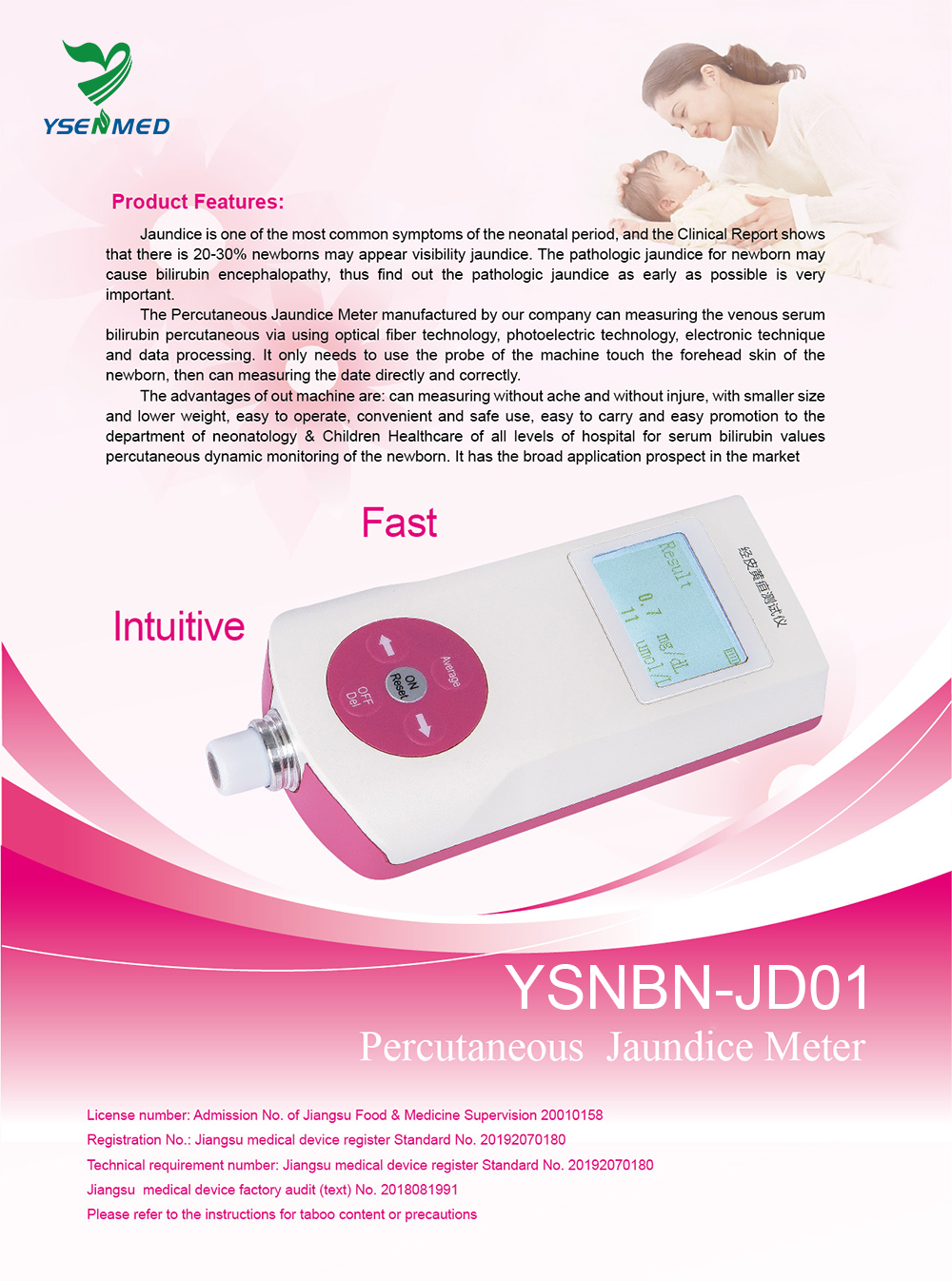 The advantages of out machine are can measuring without ache and with out inure , with smaller size and lower weight easy to operate , convenient and safe use , easy to carry and easy promotion to the department of neonatology & Children Healthcare of all levels of hospital for serum bilirubin values percutaneous dynamic monitoring of the newborn.It has the broad application prospect in the market.