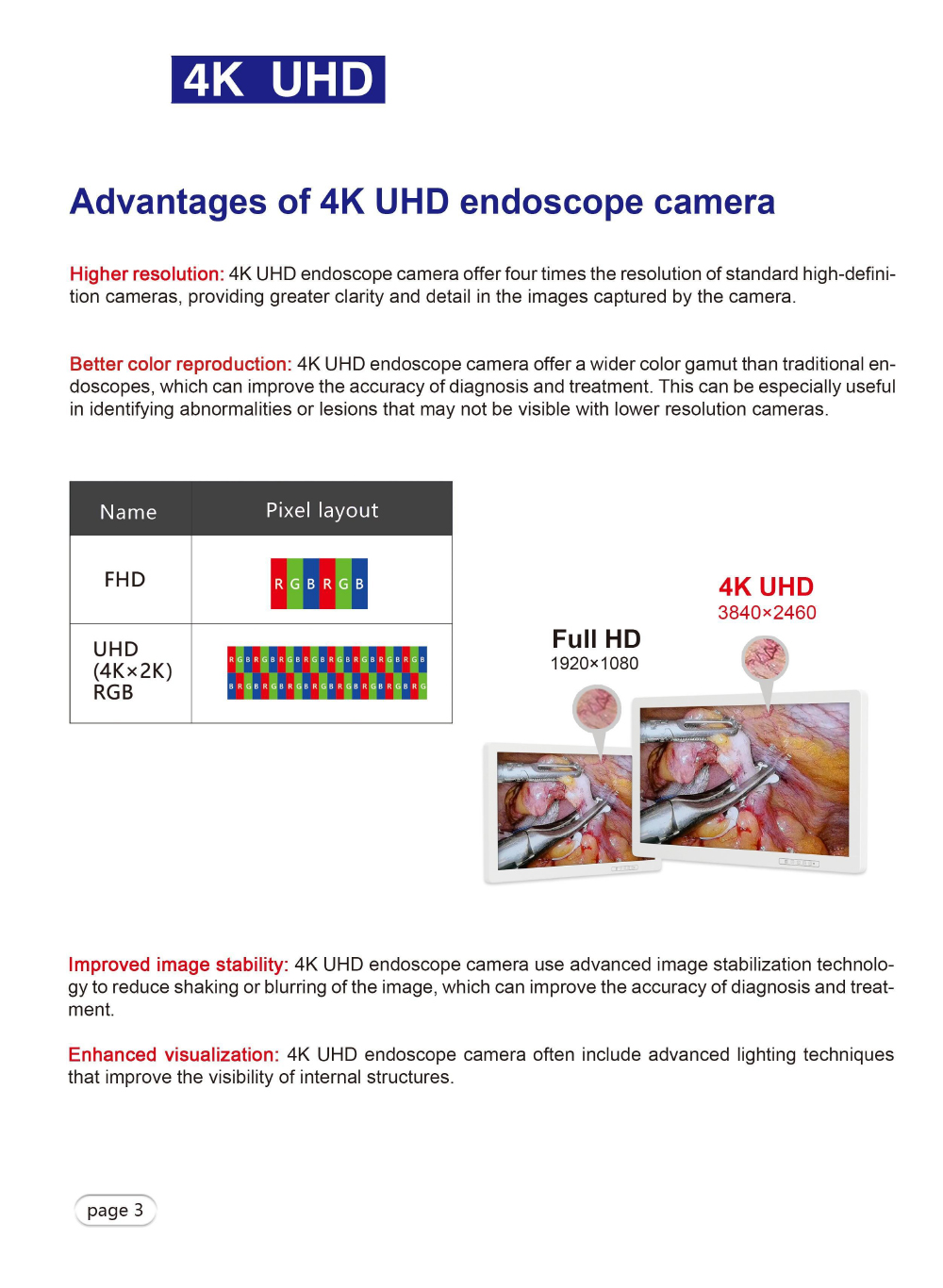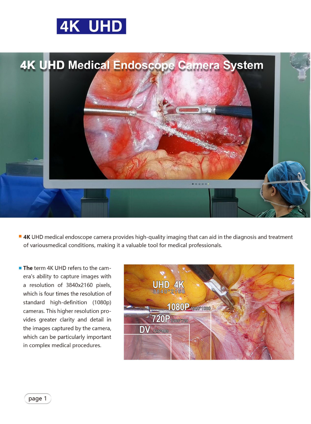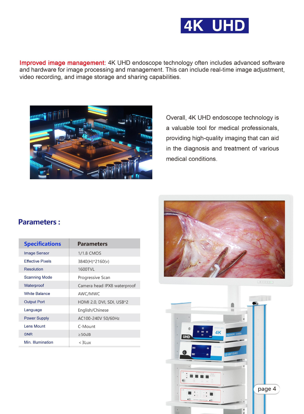 1. 4K ultra-high-definition imaging, equipped with a high-sensitivity CMOS sensor, with a resolution of 3840×2160, supports HDR (high dynamic range imaging), clearly presents tissue details and layers, and ensures dynamic operations without smearing.
